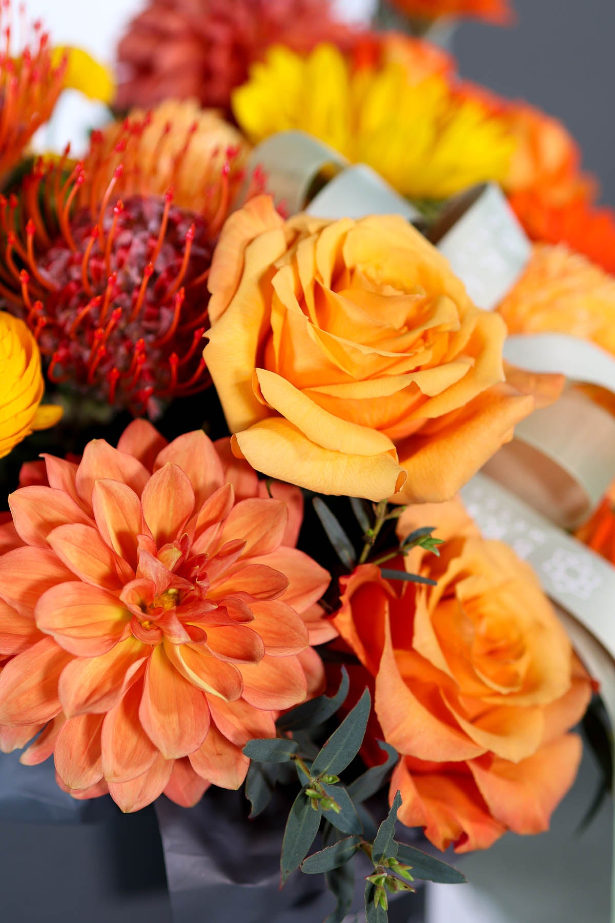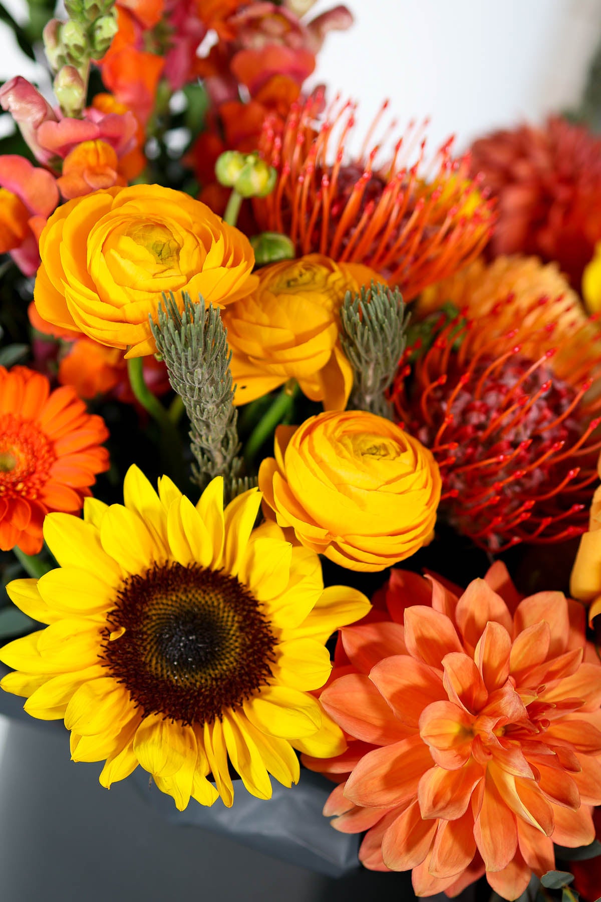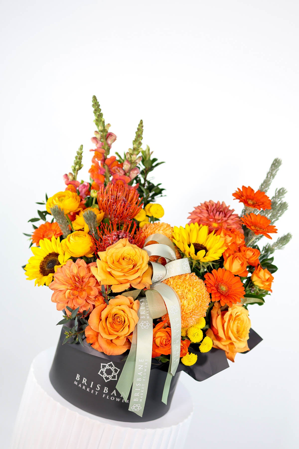 Arranged and presented in our stylish signature hat box, this dynamic display offers the best of in season blooms guaranteed to impress.
