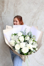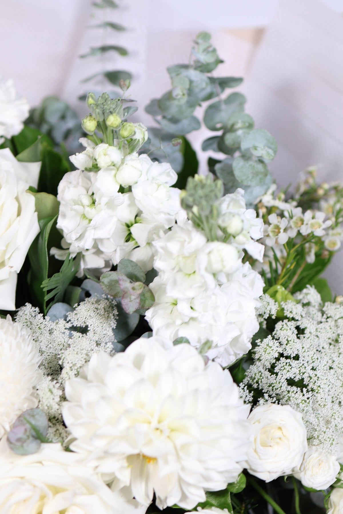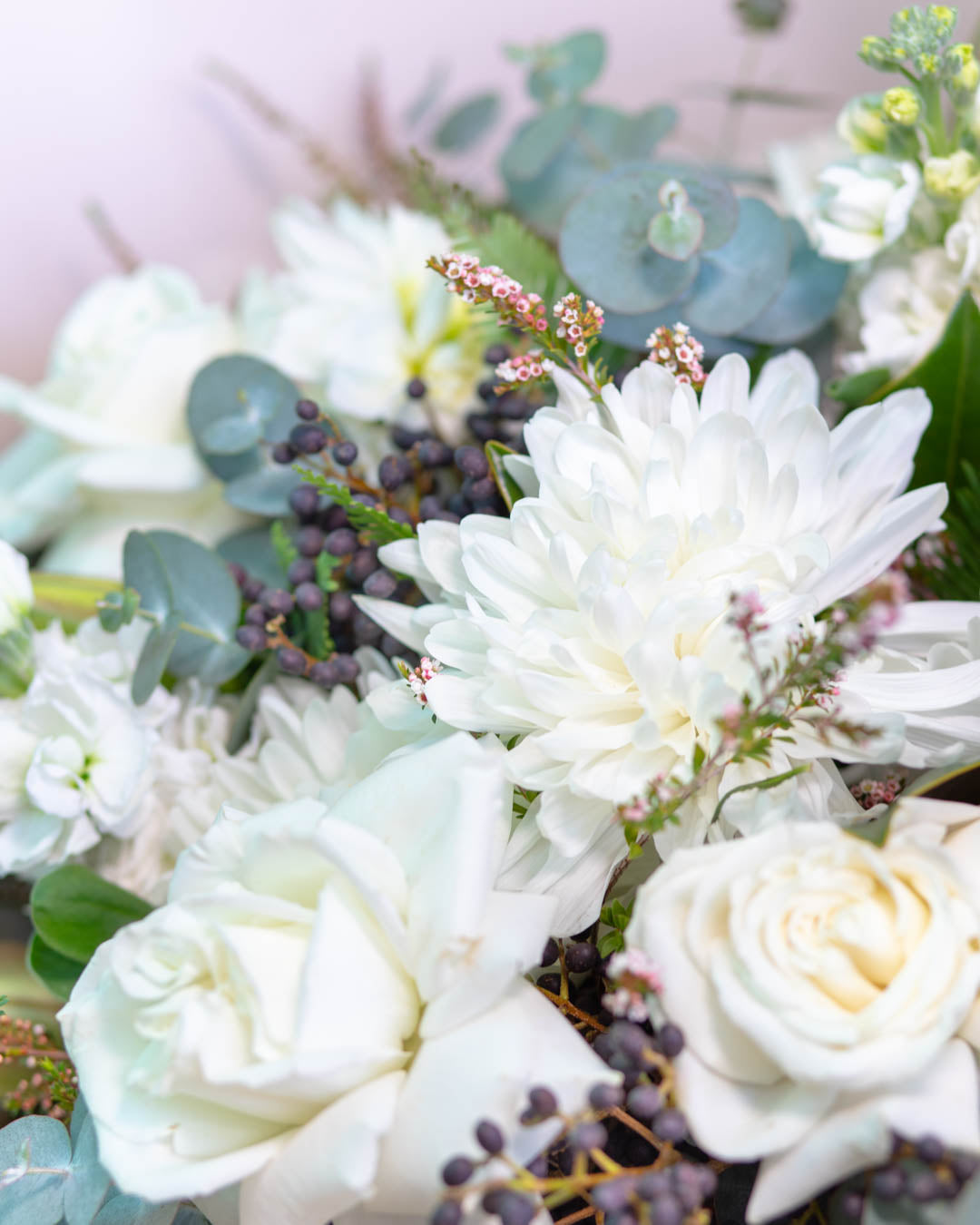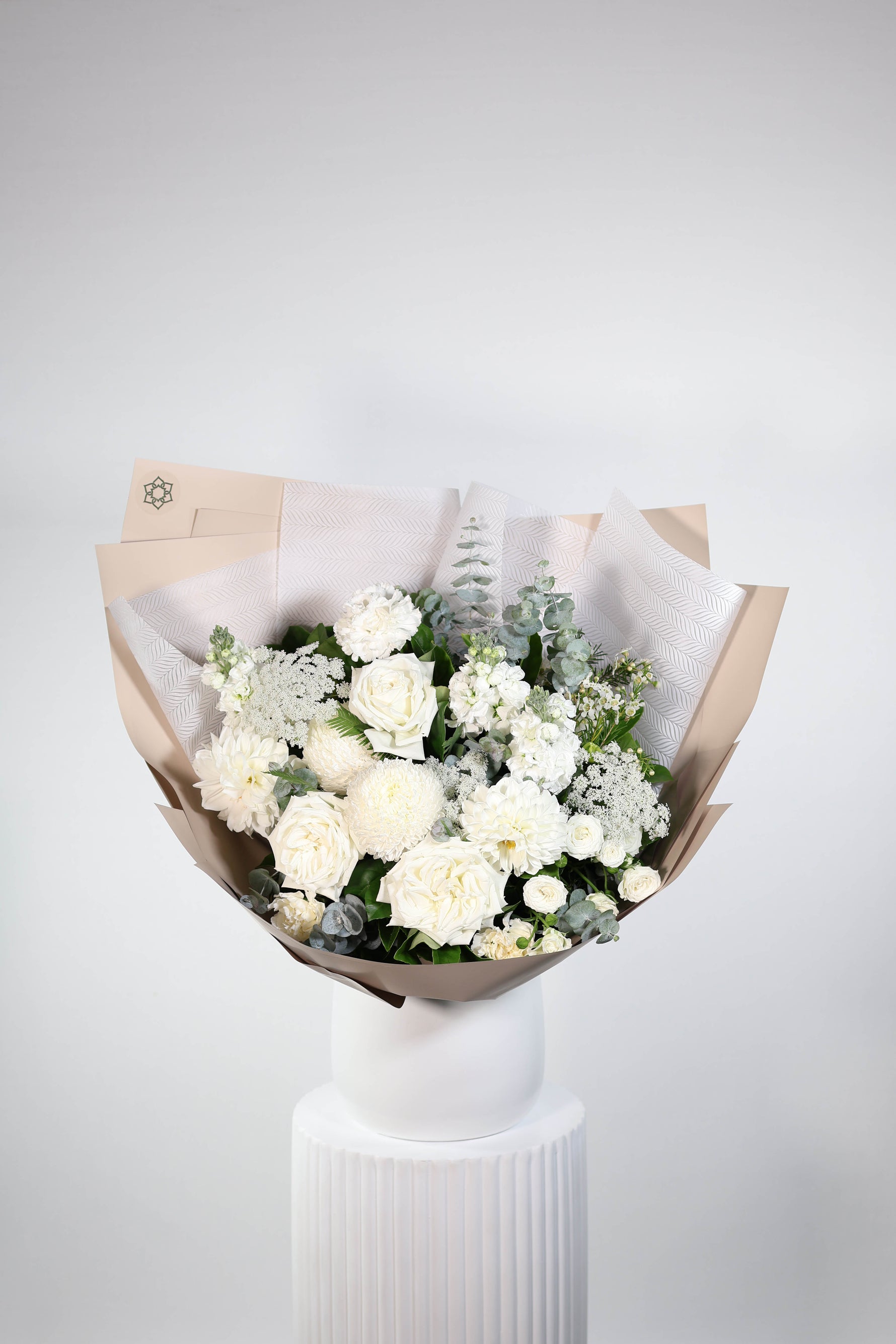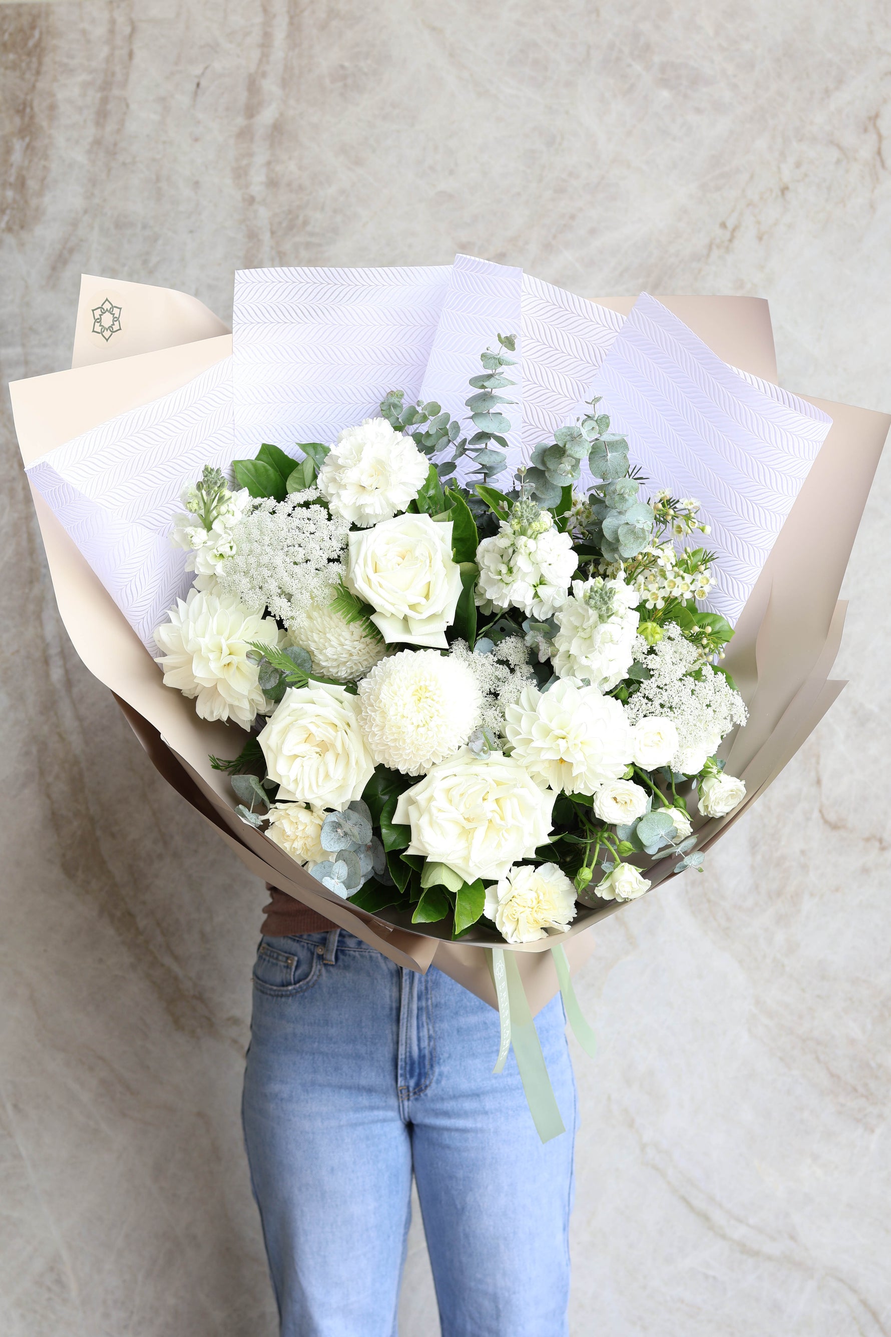 Designed for those who appreciate elegant, luxury white flowers, this arrangement blends soft textures and fresh seasonal greens to create a look that’s both peaceful and sophisticated.