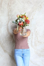 Please Note: Photos are sample images only, exact flower varieties and composition will vary due to seasonal and daily availabilities as well as market conditions and flower shortages. Our team of talented florists will craft each order to represent the colour palette and overall style of the product displayed.