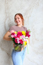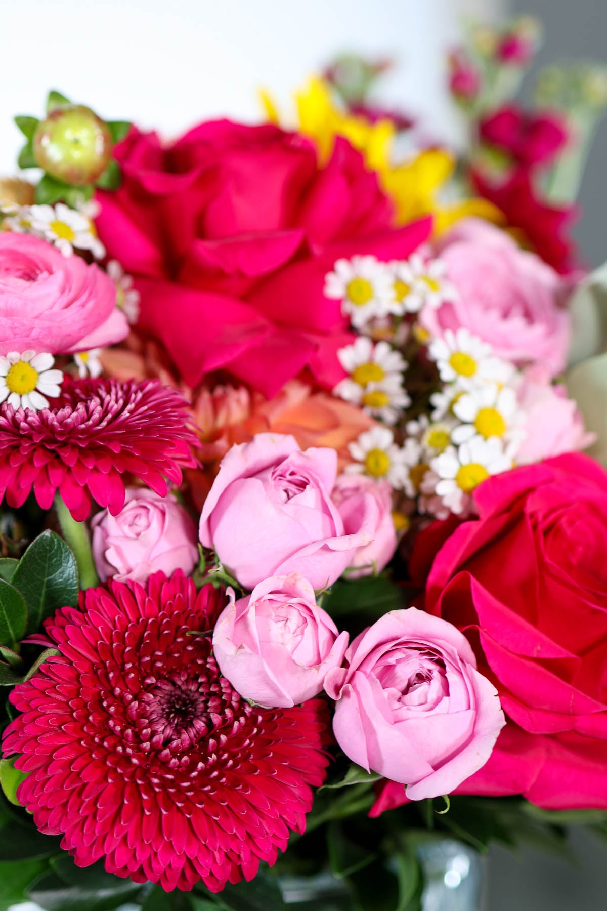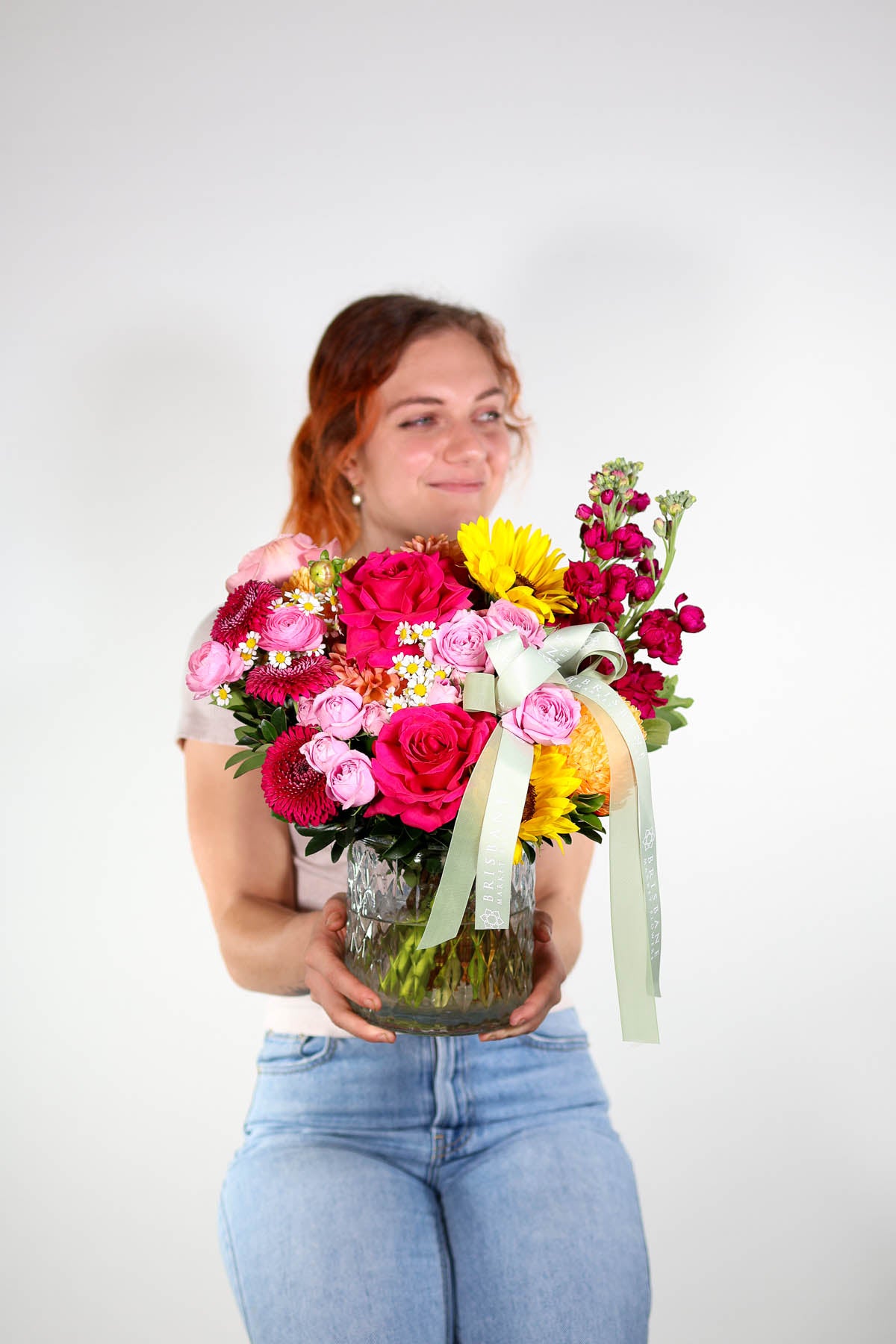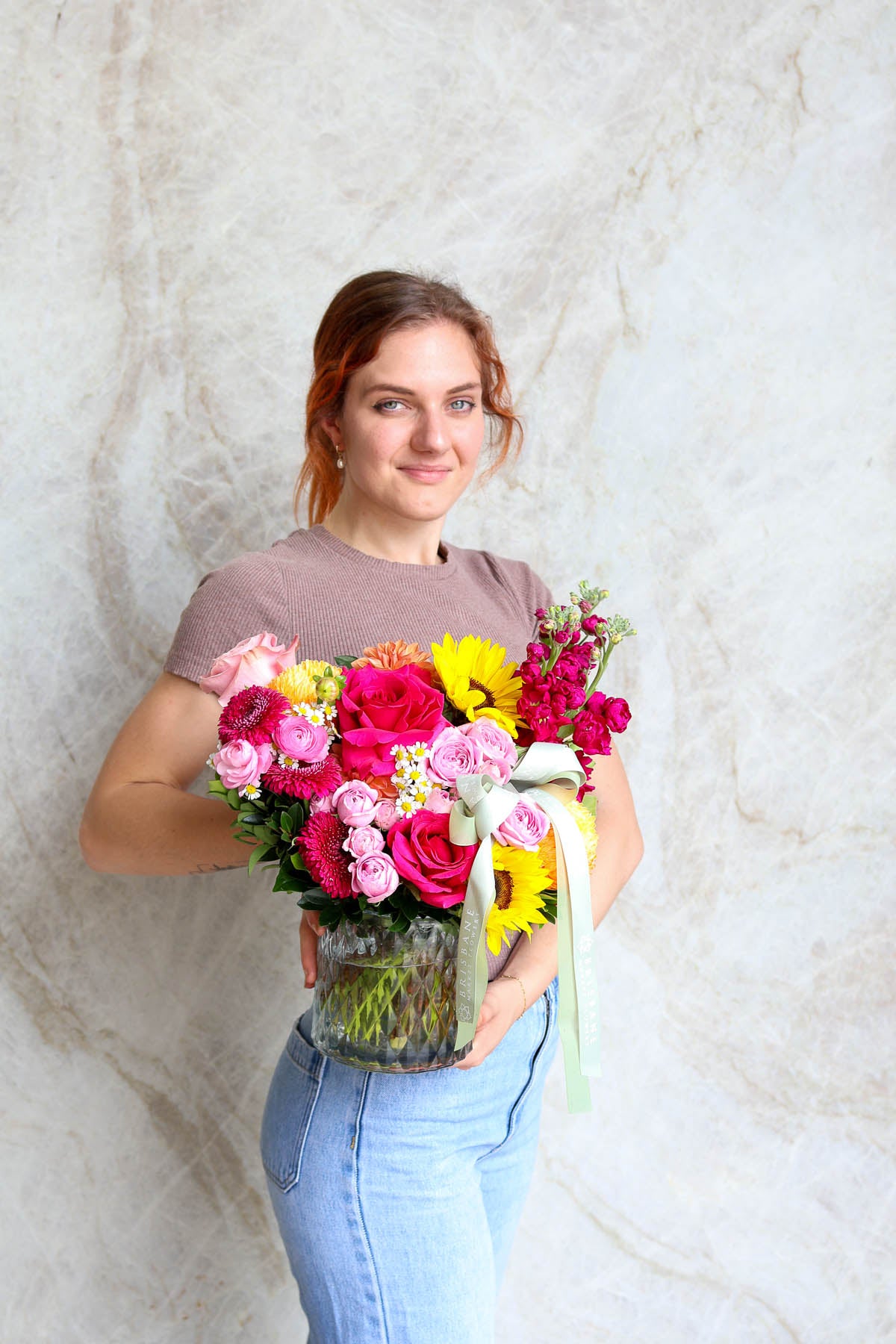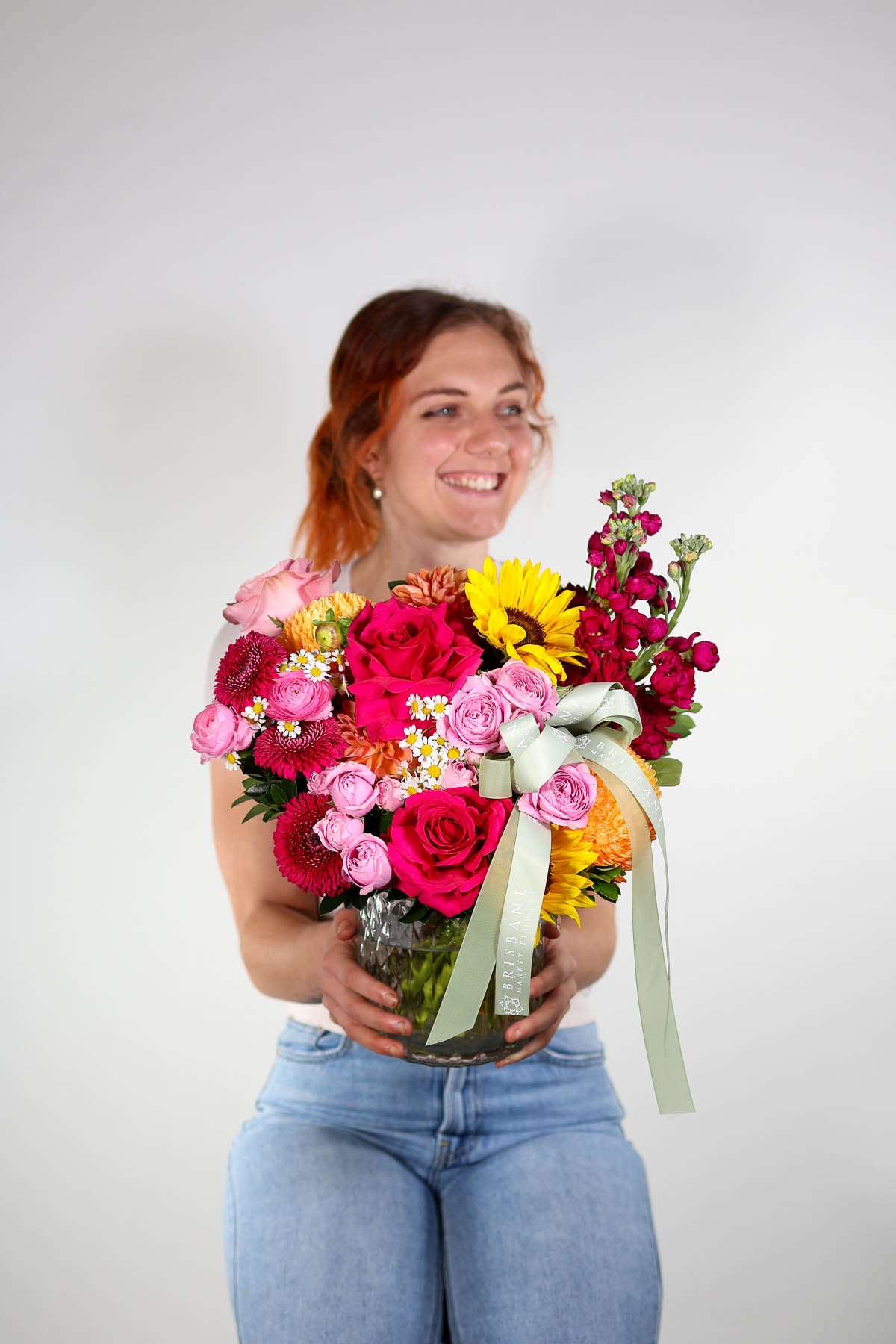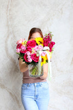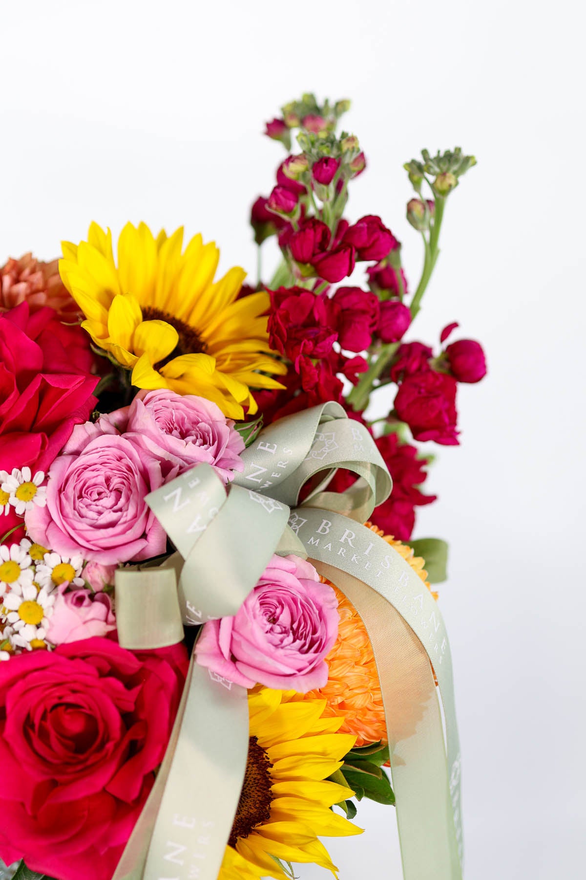 This vibrant arrangement features a cheerful mix of bold pinks, sunny yellows, and rich purples including seasonal favourites, and playful textures that celebrate the energy of summer all year round.