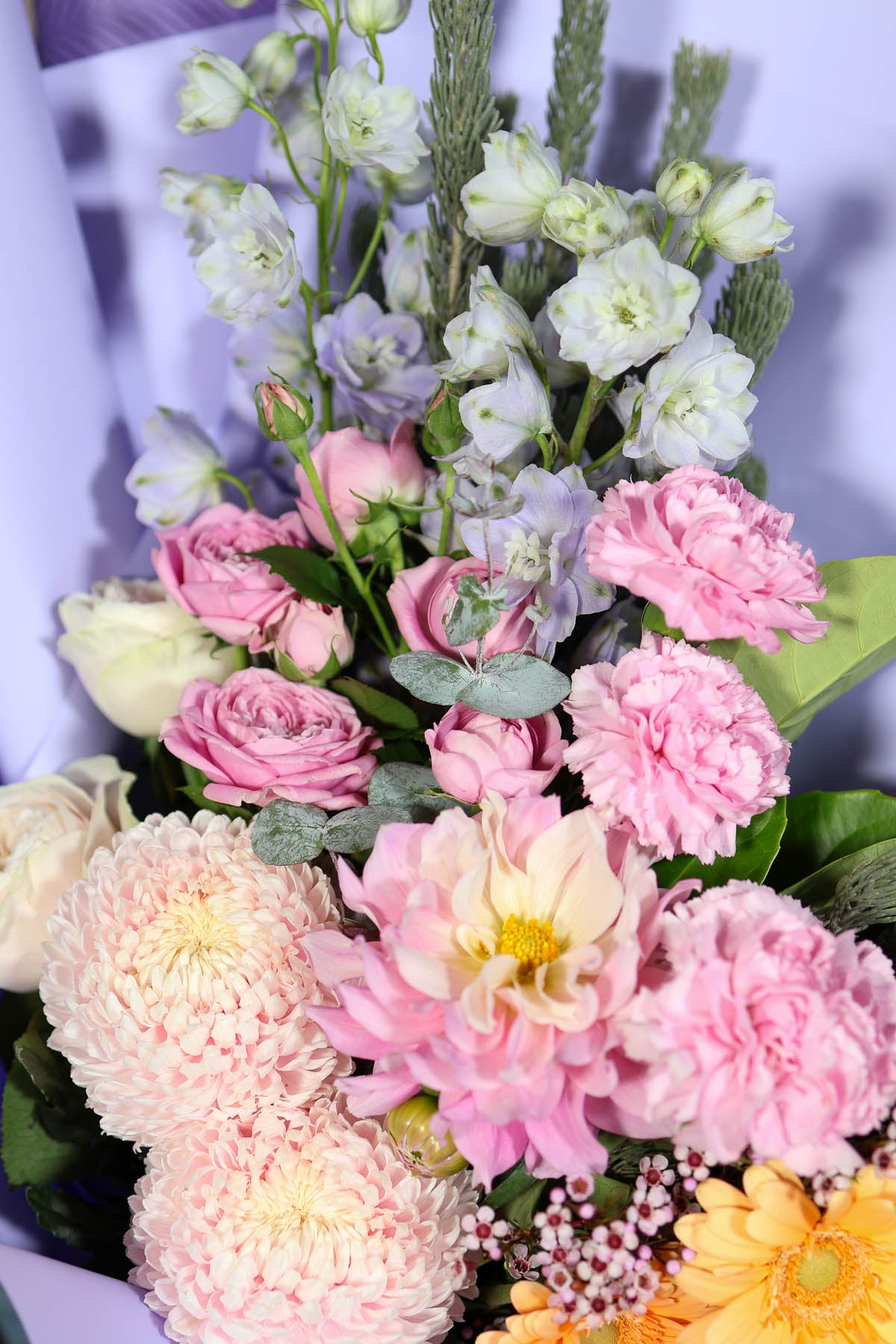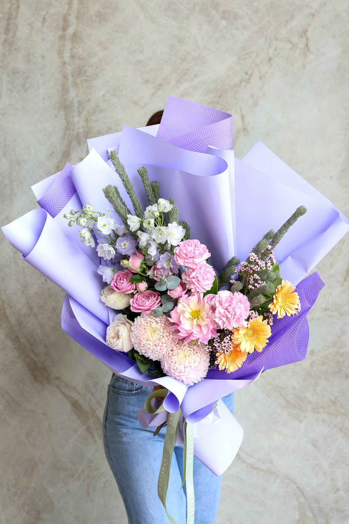 A soft pastel selection of seasonal pinks, purples and peach breathtakingly arranged into a hand tied bouquet. Wrapped in a soft palette to compliment those delicate hues!