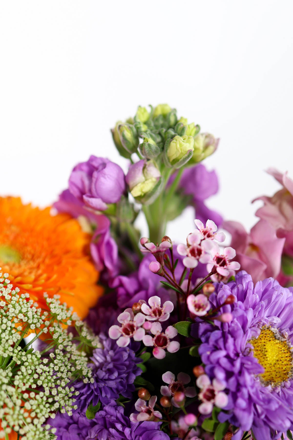 Three individual vases, each filled with the week’s best seasonal flowers